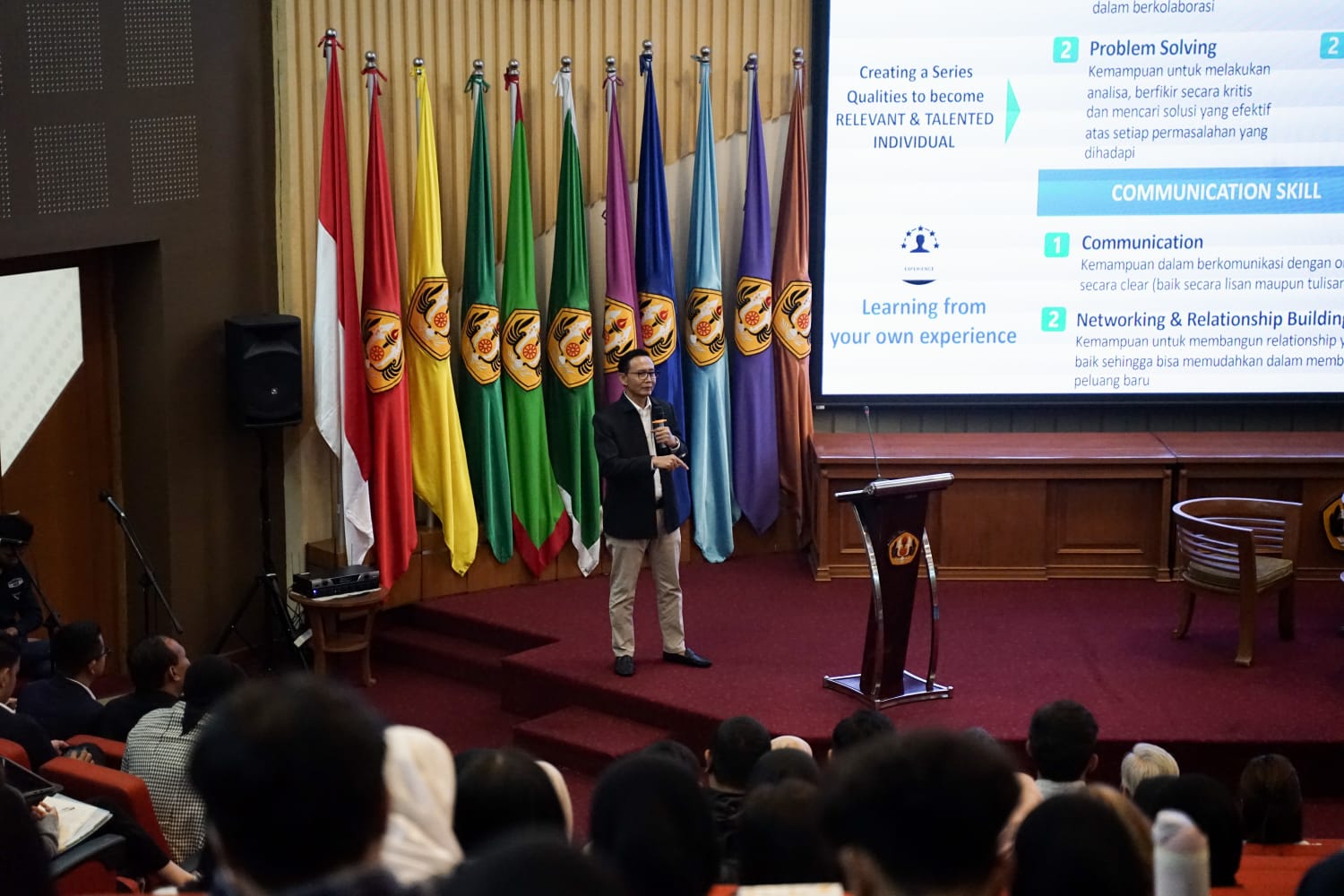 Ratusan mahasiswa serta jajaran dekanat Fakultas Ilmu Sosial dan Ilmu Politik (FISIP) Universitas Padjadjaran (Unpad). Menghadiri kuliah umum yang diselenggarakan oleh Program Studi Administrasi Bisnis FISIP Universitas Padjadjaran di Bale Sawala, Gedung Rektorat Unpad, Jatinangor, Sumedang pada Kamis (16/04/2026).
