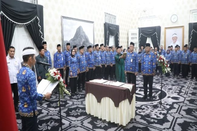 Kegiatan pelantikan berlangsung di ruang seremonial Kantor Bupati Purwakarta, dengan suasana yang resmi dan khidmat. Acara disaksikan langsung oleh seluruh kepala dinas serta camat dari seluruh wilayah Kabupaten Purwakarta. Para pejabat yang hadir tampak seragam mengenakan batik Korpri berwarna biru khas Aparatur Sipil Negara (ASN), memberikan kesan kesatuan dan profesionalisme.