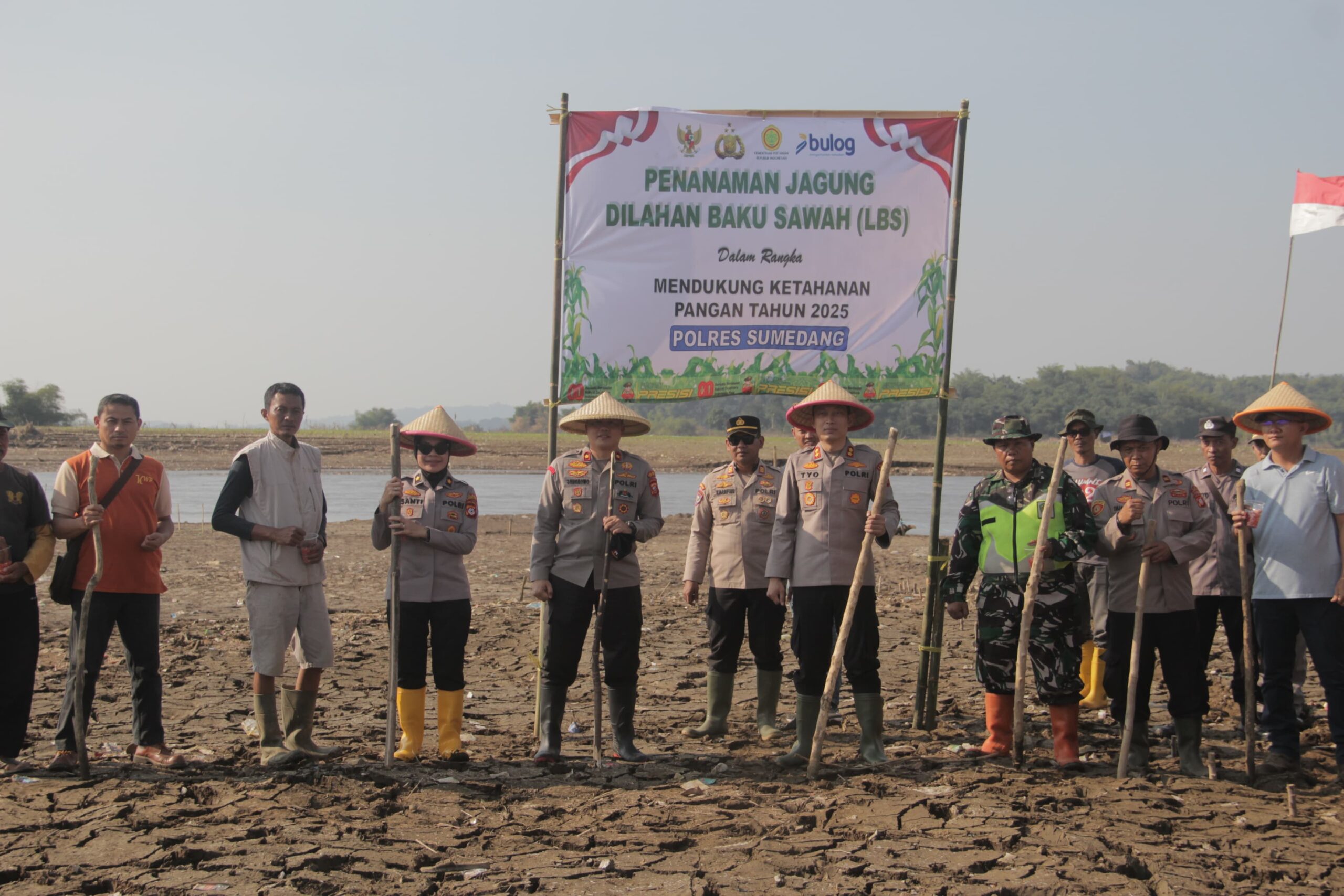 Sumedang,Hallo Berita Online.Com-Dalam upaya mendukung program ketahanan pangan nasional tahun 2025 yang dicanangkan oleh Presiden Republik Indonesia Prabowo Subianto, Polres Sumedang melaksanakan kegiatan penanaman benih jagung di lahan baku sawah (LBS) seluas 20 hektar yang berlokasi di Tugu Wado, pesisir Waduk Jatigede, Dusun Maleber, Desa Wado, Kecamatan Wado, Kabupaten Sumedang, Sabtu (2/8/2025) sore.