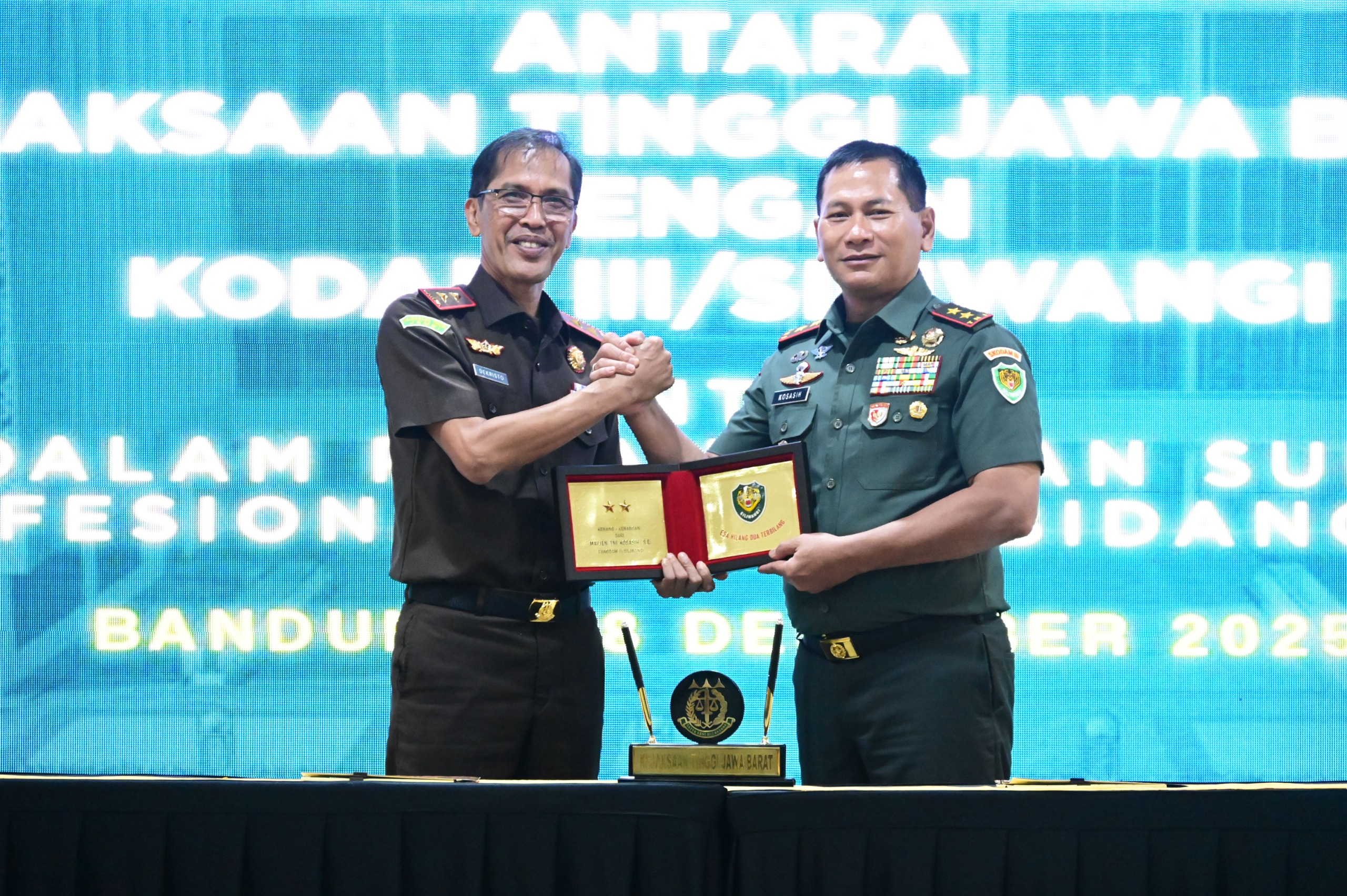 Kajati Jabar Dr. Hermon Dekristo, S.H., M.H menandatangani Perjanjian Kerjasama antara Kejaksaan Tinggi Jawa Barat dengan Komando Daerah Militer III/Siliwangi yang di tandatangani oleh Panglima Kodam III/Siliwangi Mayor Jenderal TNI Kosasih,S.E., diselenggarakan di Aula R.Soeprapto Kejati Jabar (18/12/25).