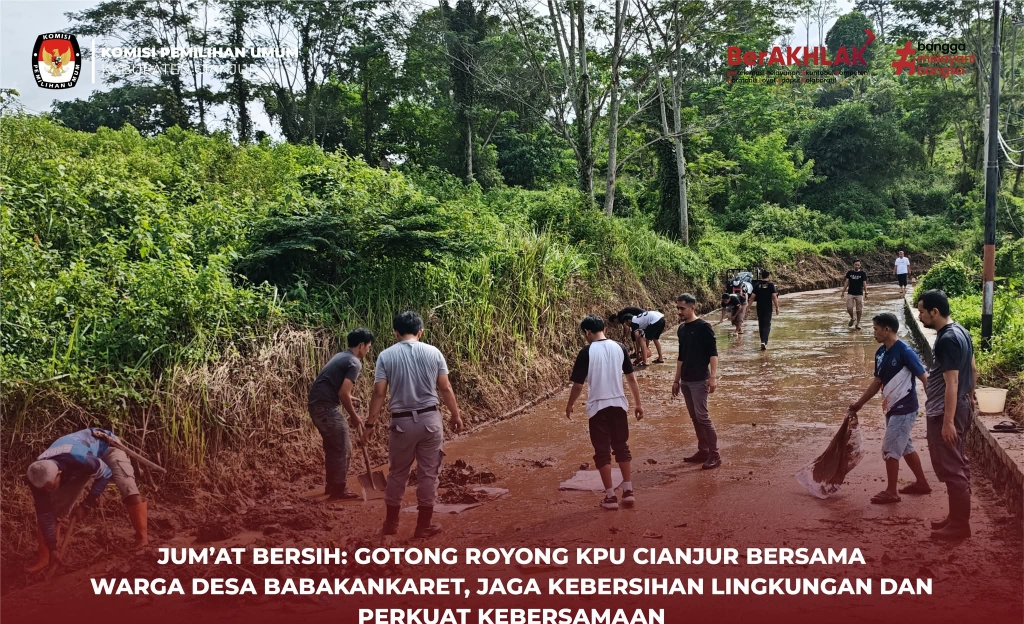 Komisi Pemilihan Umum (KPU) Kabupaten Cianjur melaksanakan kegiatan “Jumat Bersih” di lingkungan kantor pada Jumat (14/11/2025), bekerja sama dengan Pemerintah Desa Babakankaret, Kecamatan Cianjur.