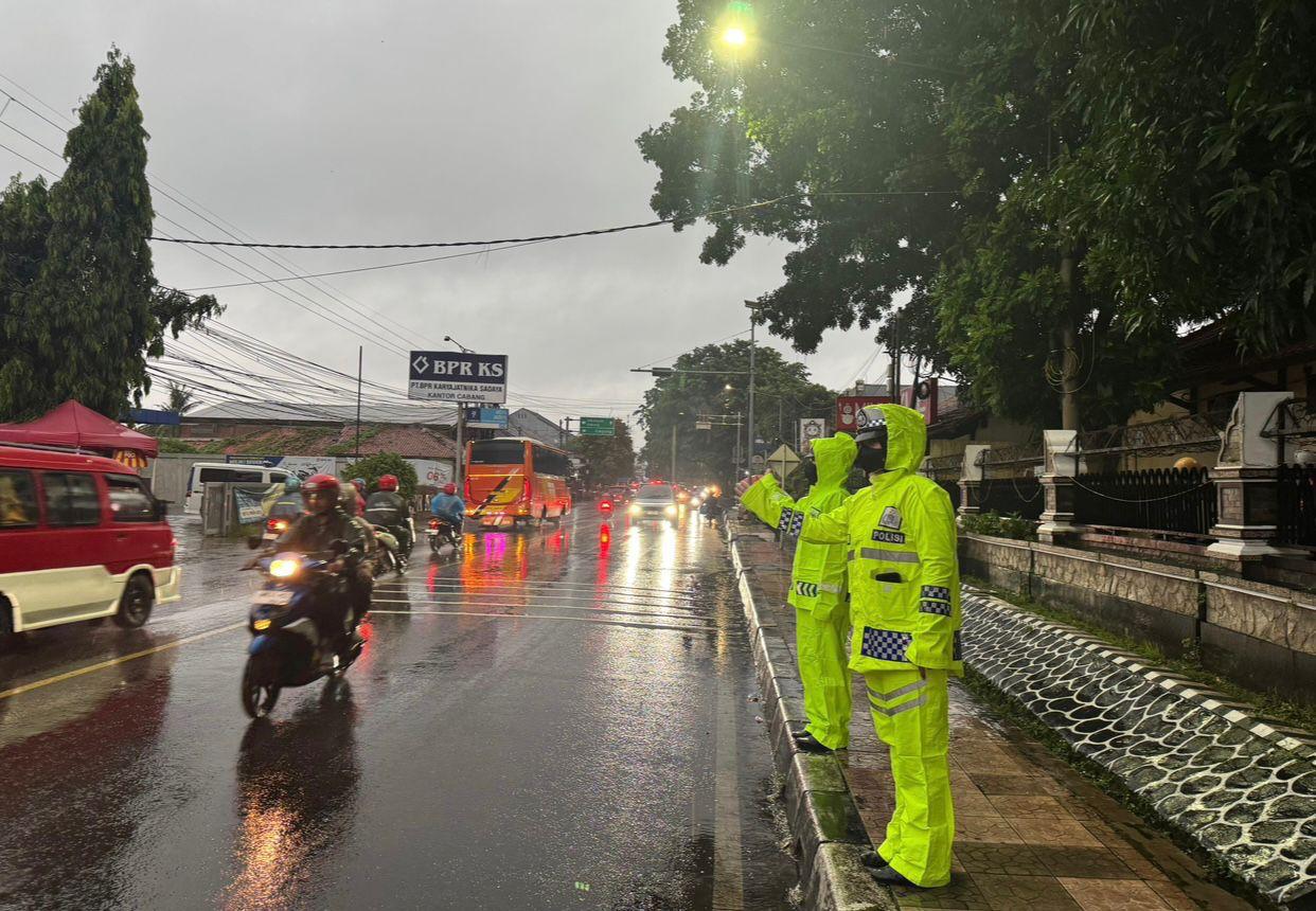 Lengkap dengan menggunakan jas hujan, Polisi cantik melakukan pengaturan arus lalulintas di simpang jalan, tempat-tempat yang rawan kemacetan, rawan lakalantas, pusat keramaian serta di depan Sekolah, pada Selasa, (19/8/2025).