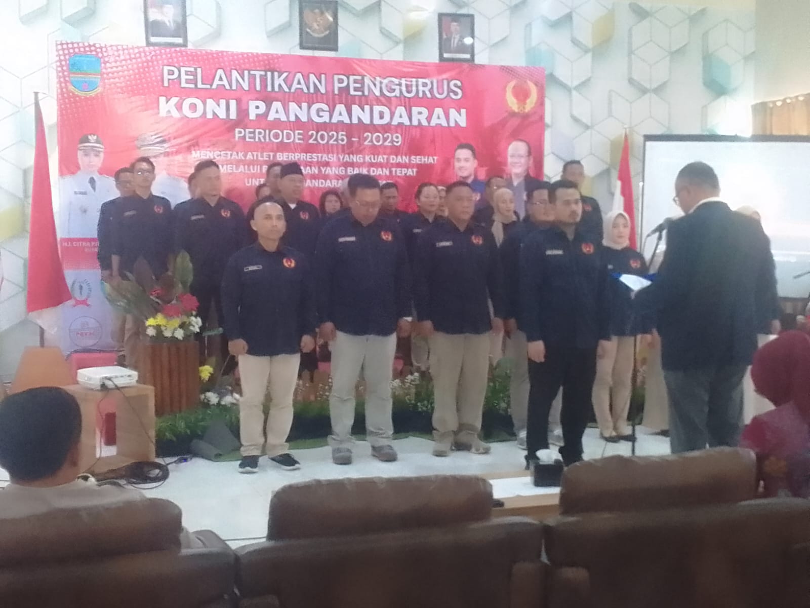 Pangandaran,Hallo Berita Online.Com-Komite Olahraga Nasional Indonesia (KONI) Kabupaten Pangandaran resmi melantik jajaran pengurus baru periode 2025–2029 dalam sebuah seremoni khidmat yang digelar di Aula Hotel Aquarium, Pangandaran, Kamis (26/02/2026).