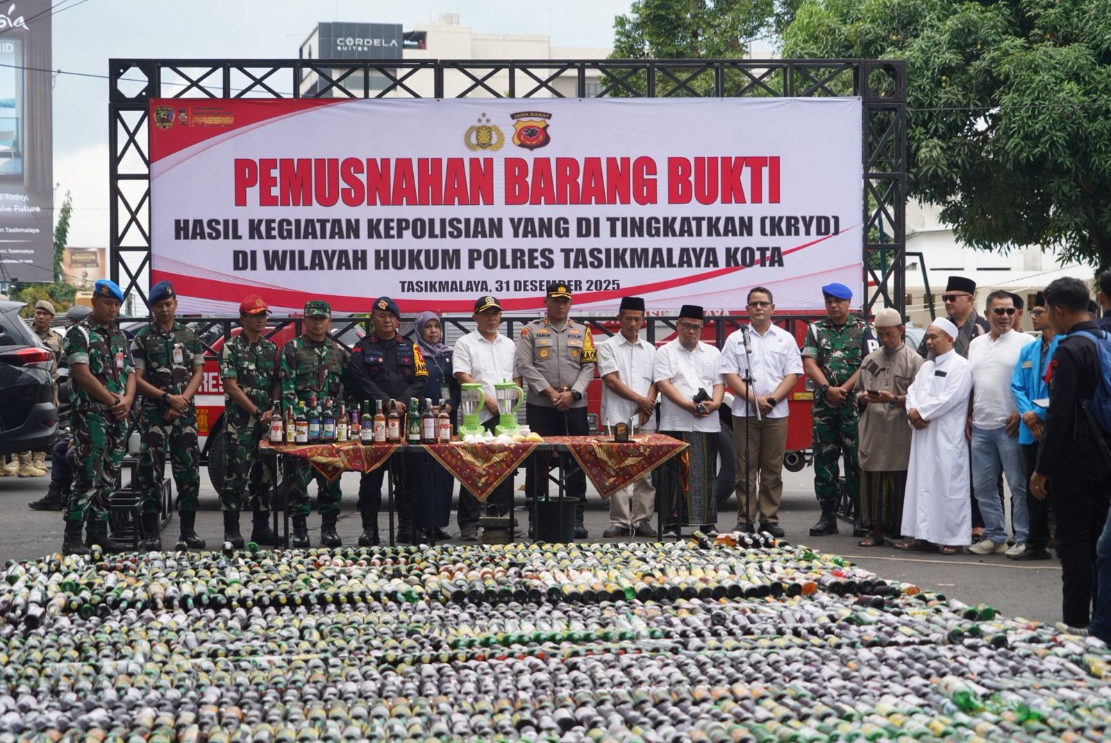 Kota Tasik,Hallo Berita Online.Com- Menjelang malam pergantian tahun, Polres Tasikmalaya Kota mengambil langkah tegas dengan memusnahkan ribuan barang bukti hasil Operasi Kegiatan Rutin yang Ditingkatkan (KRYD) dan Operasi Pekat. Kegiatan pemusnahan berlangsung di Taman Kota Tasikmalaya, Rabu (31/12/2025), dan disaksikan unsur Forkopimda serta tokoh masyarakat.
