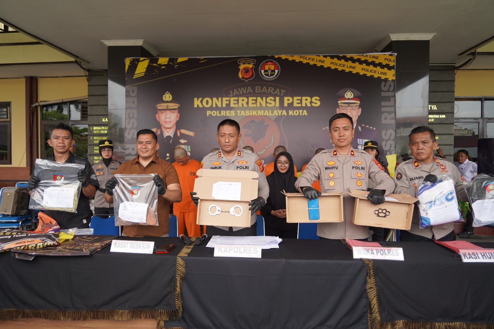 Press release tersebut dipimpin oleh Kapolres Tasikmalaya Kota AKBP Moh. Faruk Rozi, S.H., S.I.K., M.Si., didampingi Kasat Reskrim dan jajaran penyidik Sat Reskrim, Rabu (05/11/2025).